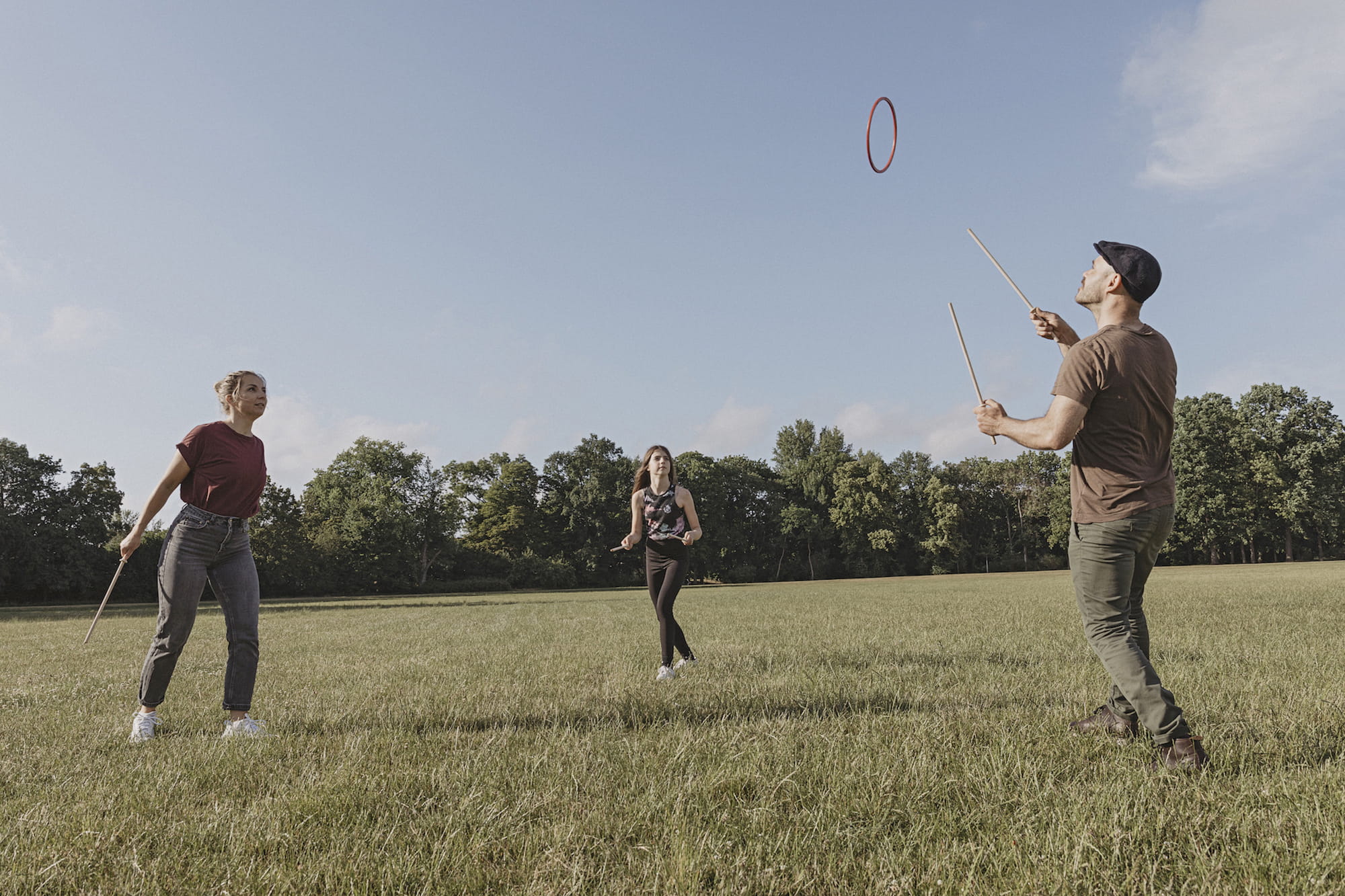 Umieść pierścień na patyczkach, przepraw je, a następnie rozciągnij - pierścień zyskuje prędkość i unosi się w powietrzu. Dzięki temu ćwiczeniu można osiągnąć odległości do 30 metrów.