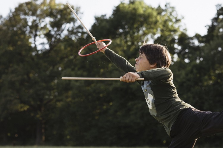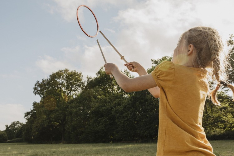 Umieść pierścień na patyczkach, przepraw je, a następnie rozciągnij - pierścień zyskuje prędkość i unosi się w powietrzu. Dzięki temu ćwiczeniu można osiągnąć odległości do 30 metrów.