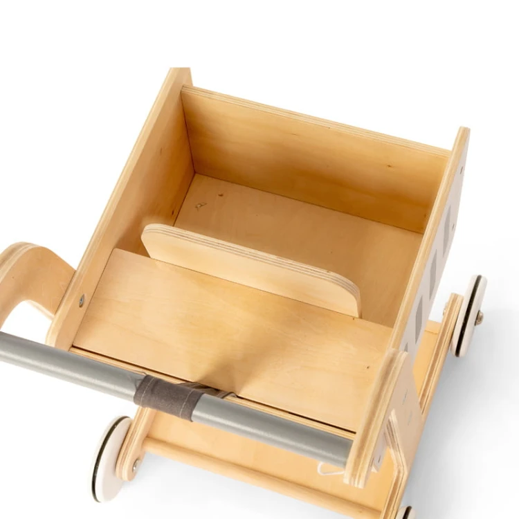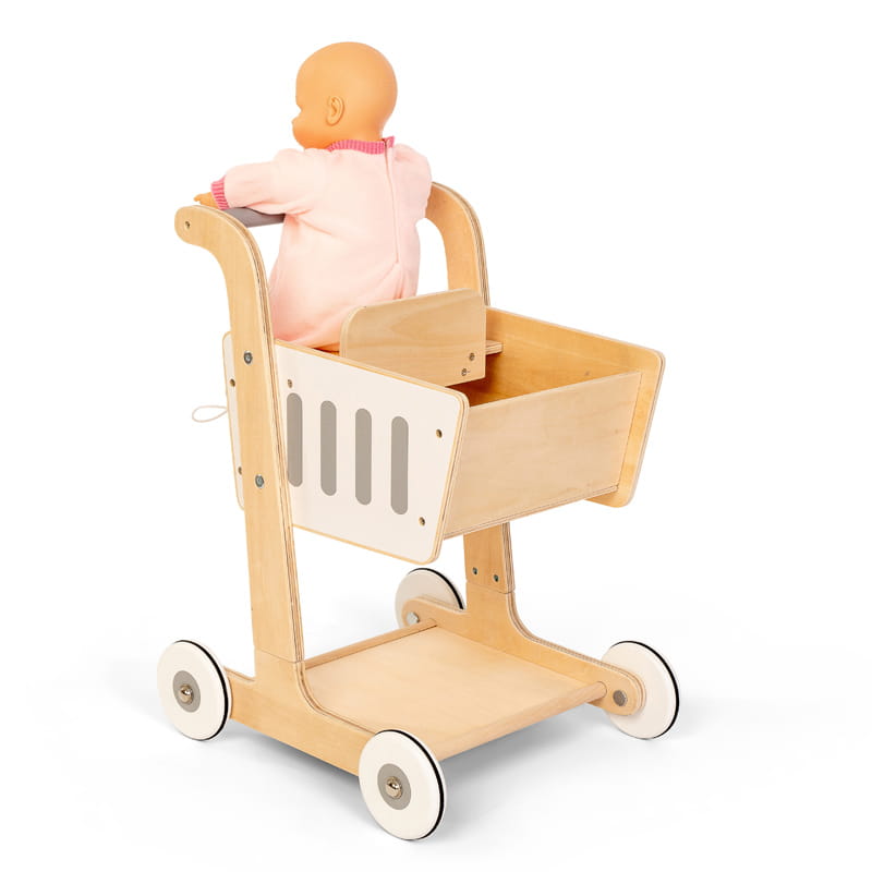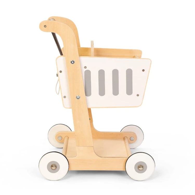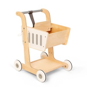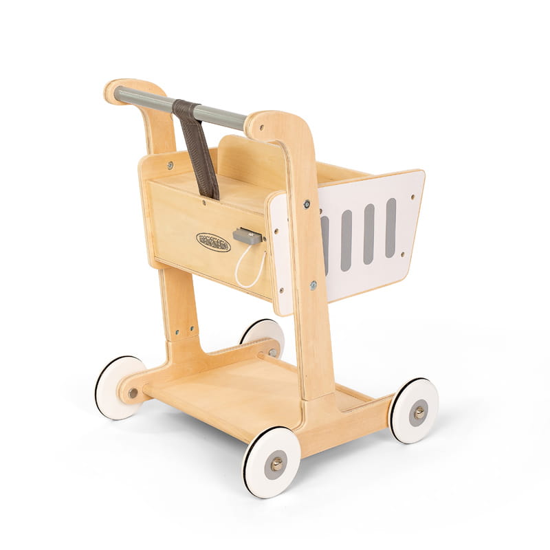 Jest również dużo miejsca na przedmioty zarówno w koszu, jak i na półce pod wózkiem. Oczywiście, podobnie jak w przypadku prawdziwych wózków sklepowych, jest również zamek na monety.Na drewnianych kołach wózka na zakupy znajdują się gumowe pierścienie, które zapobiegają zarysowaniu drewnianych podłóg. Ten wspaniały wózek na zakupy zainspiruje godziny pomysłowej zabawy.